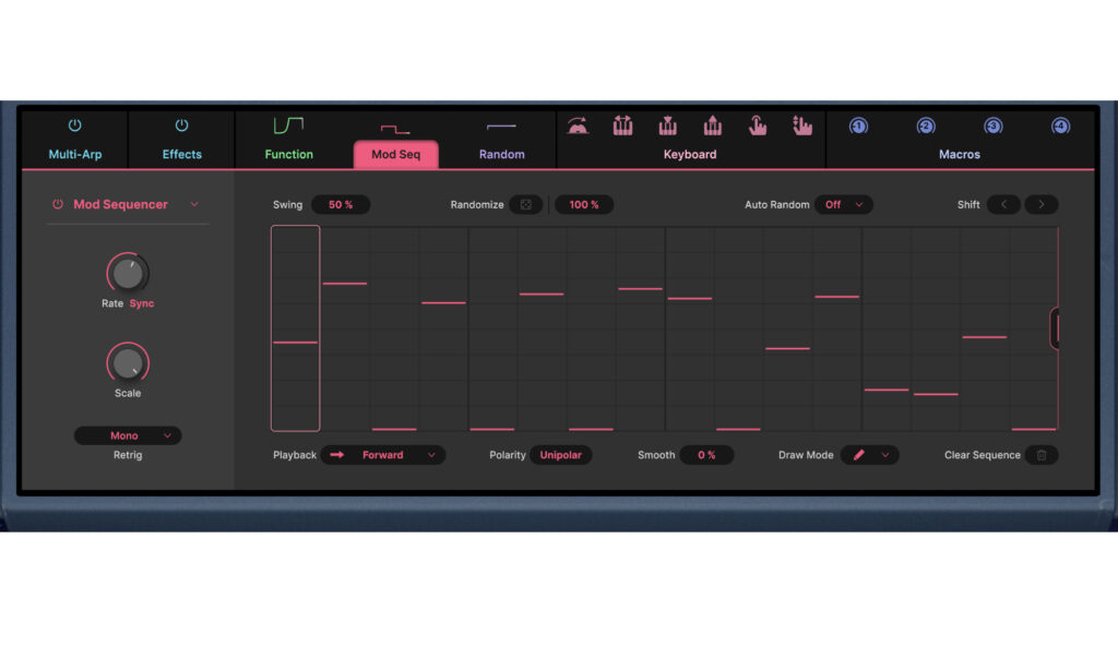 Wenn es noch mehr ins Detail gehen soll, bitte sehr: Im Advanced Panel gibt es noch Function, Mod Seq und Random zu entdecken. Anders als der JP-8000 erlaubt das französische Pedant enorme modulative Tiefgänge.