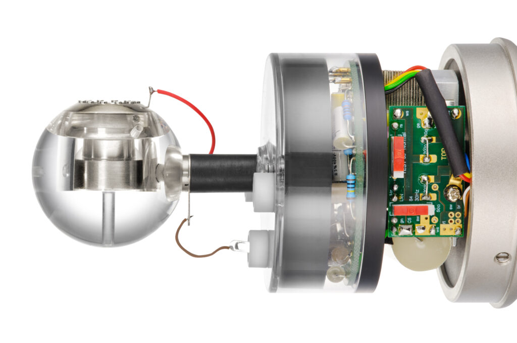 Die Kleinmembran ist bündig in einen Ball aufgesetzt (“Pressure Sphere”). Das verändert die Druckverhältnisse an der Membran und ist eine Art Equalizer für die nicht axial eintreffenden Signale. Derartige Bälle gibt es als Aufsätze für Schoeps- und DPA-Kleinmembraner.