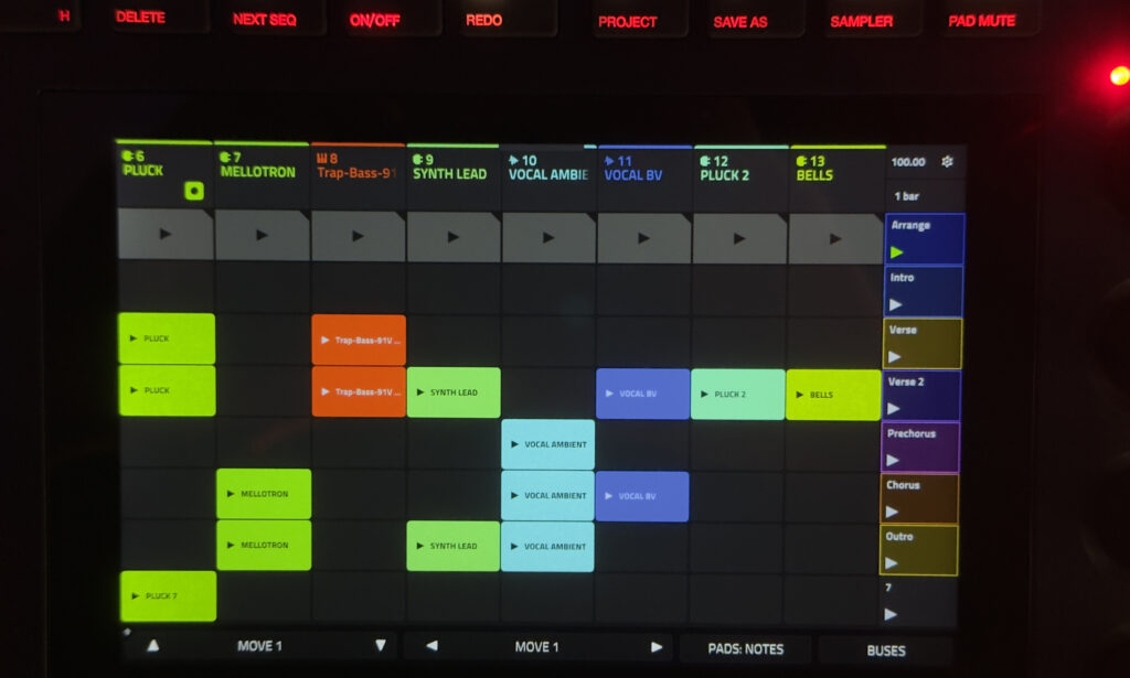 Die Clip-Matrix bringt euch praktisch den Ableton Live Workflow auf die MPC: Bis zu 8 Spuren × 8 Szenen (64 Clips) lassen sich gleichzeitig über Pads oder Touchscreen starten, stoppen und kombinieren. Farbcodiert und somit übersichtlich . Damit sind Live-Performance oder spontane Arrangements ähnlich wie in Ableton möglich.