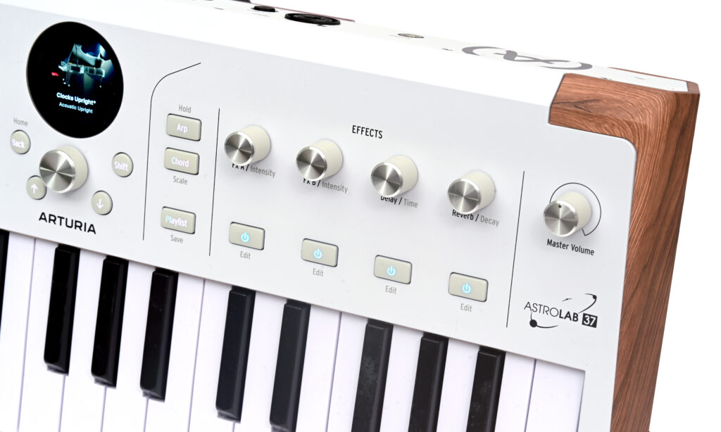 Im Vergleich zum Astrolab 88 ist das Display hier allerdings flach verbaut, die Encoder sind ferner etwas schmaler sowie anders angeordnet – ansonsten ist die Bedienoberfläche soweit identisch. Nur die Split-Mode-Taster und den Recorder bzw. Looper gibt es beim 37er leider nicht. Ferner unterscheidet sich auch die CPU-Leistung ein wenig, wobei das 61er und das neue 37er identisch sind, und das 88er in der Tat noch etwas kräftiger ist.