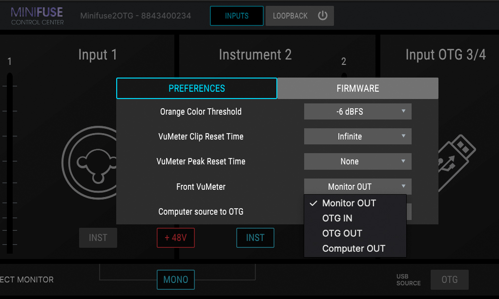 Die LEDs des MinFuse sind allesamt weiß-blau gehalten, lediglich der +48V-Phantom-Taster und der Gain-Clip leuchten rot. Hinzukommt eine weitere, etwas detailliertere Aussteuerungsanzeige für die Ausgänge, deren Quelle sich wiederum in der Software umstellen lässt.