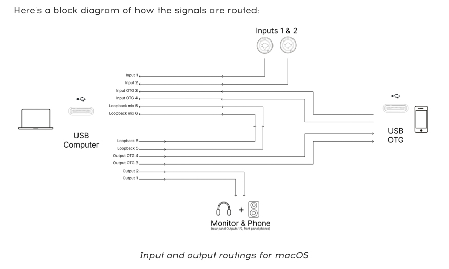 Zusätzlich lässt sich über den zweiten USB-Port ein weiteres Stereo-USB-Audiogerät – etwa ein iPhone oder iPad – digital einbinden. Dadurch kann man das Tablet ohne Verlust direkt in die DAW überspielen sowie auch über die selben, angeschlossenen Lautsprecher Musik hören.