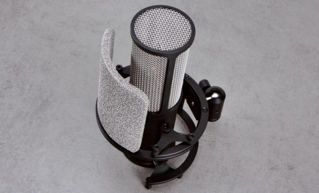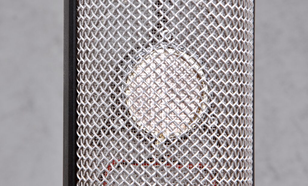 Das Austrian Audio OC-S10 ist optisch kein Leisetreter: 63 mm Durchmesser und 205 mm Länge erzeugen ein visuelles Gravitationsfeld im Studio, erst recht in Verbindung mit der elastischen Halterung. In ebenjene wird das Mikrofon eingeschraubt, welches dann durch elastische Laschen an Ort und Stelle gehalten wird. Der Metall-Poppschutz wir magnetisch am oberen Teil der Halterung angebracht.