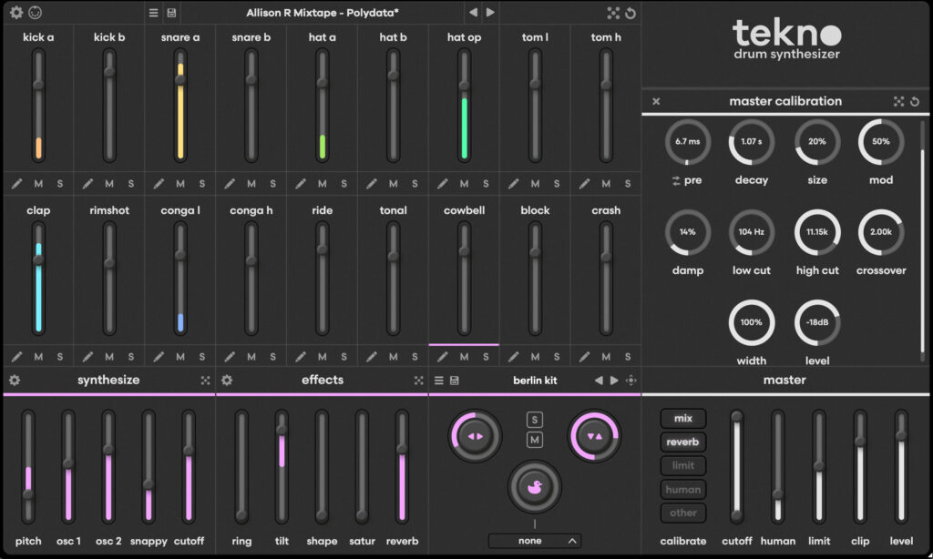 Insgesamt bietet Tekno so zwei unterschiedliche Kick-Engines, zwei Snares, drei HiHats sowie elf weitere perkussive Begleiter wie Toms, Congas, Rims und Claps.