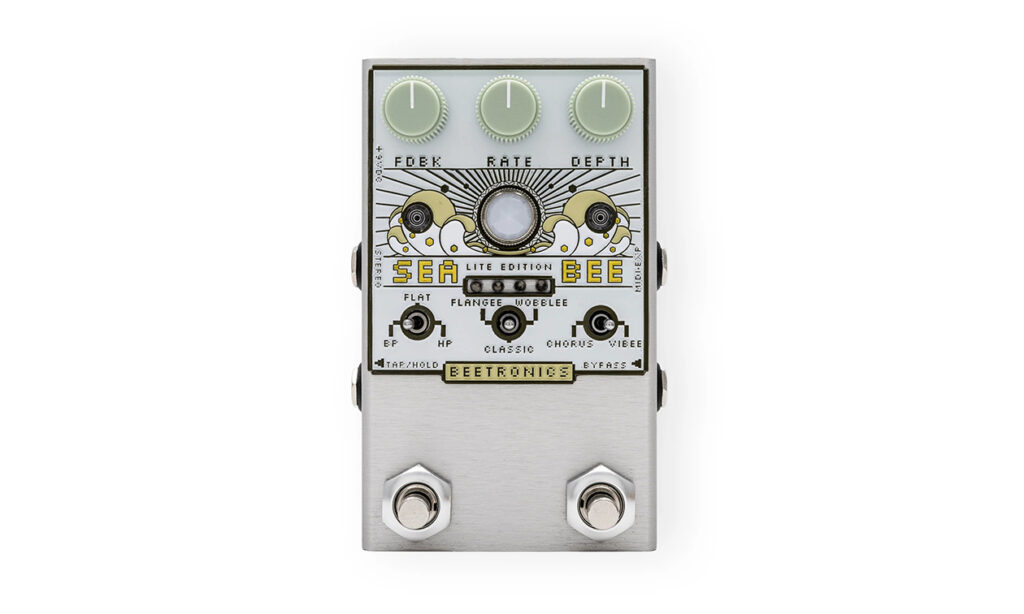 Der Beetronics Seabee Lite platziert sich als Variante des Seabee HarmoChorus. Während Letzterer den Chorus-Effekt in aller Tiefe erforscht, stehen hier drei umschaltbare Chorus-basierte Effekte zur Auswahl: Classic (Dreiecksmodulation, 10 ms Verzögerung), Flangee (Flanger-artiger Effekt mit eigenständiger Modulationskurve und kürzerer Verzögerungszeit) sowie Wobble (zufälliger LFO und leicht längerer Verzögerungszeit). Hinzu kommt die Möglichkeit, zwischen einer 50/50 Dry/Wet-Signalmischung (Chorus) und einem reinen Effektsignal (Vibrato) zu wechseln. Die analog generierten Klänge sind geradlinig ausformbar und werden durch ein schaltbares zweistufiges Multimodefilter (Hoch- und Bandpass) für das Effektsignal in der Klangvielfalt erweitert. Das Ergebnis lässt sich in 16 Speicherplätzen ablegen, wodurch das Seabee Lite auch auf der Bühne variabel genutzt werden kann.