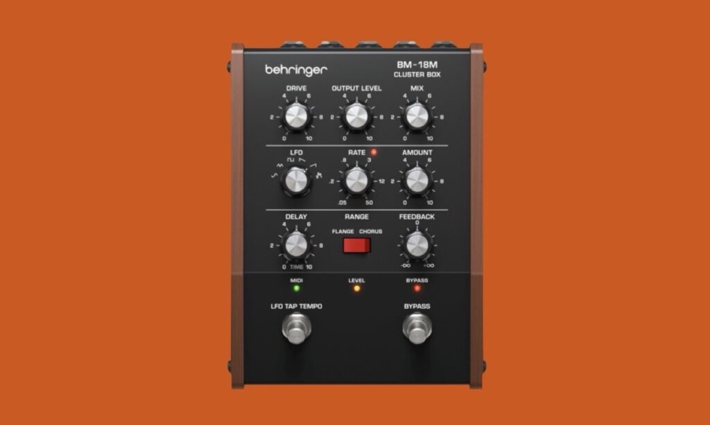 Bei der BM-18M Cluster Box handelt es sich um eine Kombination aus den Effekten Chorus und Flanger. Die LFO-Sektion wurde mit sechs Schwingungsformen ausgestattet. Es können die Parameter Rate, Amount, Delay und Feedback moduliert werden. Die LFO-Geschwindigkeit wird mithilfe des Tap-Tempo-Fußschalters eingestellt.