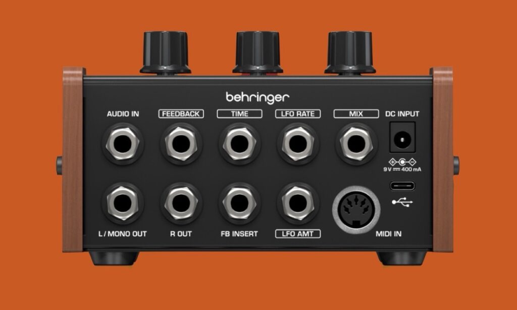 • Anschlüsse: Audio In (6,3 mm Klinke), L/Mono & R Out (2 × 6,3 mm Klinke), Feedback, Time, LFO Rate, Mix, FB Insert & LFO AMT (6 × 6,3 mm Stereoklinke), MIDI (5-Pin DIN), USB-C