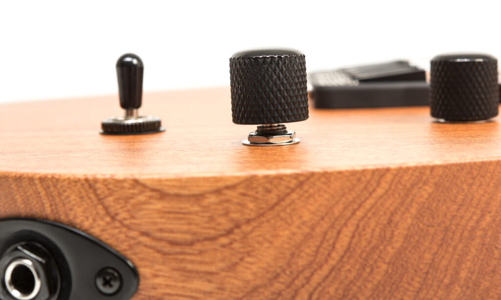 Unser Testmodell ist mit zwei speziellen Pickups (Custom Pro 7 Passive Alnico Humbucker ) für 7-Saiter aus eigenem Hause ausgestattet. Sie kommen recht schnörkellos ohne Rahmen, die Pole-Pieces sind sichtbar. Geschaltet werden die beiden Tonabnehmer über einen Drei-Wege Toggle-Switch, mit dem die üblichen Kombinationen möglich sind, beide Pickups einzeln und in der Mittelstellung beide gemeinsam. Die Tonabnehmer können per Push/Pull Poti (Volume) auch gesplittet werden, sodass wir sechs unterschiedliche Grundsounds zur Verfügung haben. Geregelt wird das Ganze mit einem Master Volume und Master Tone-Poti. Potis und Schalter sind nicht von allerhöchster Güte, das Volume-Poti wackelt und der Schalter hat manchmal etwas Kontaktschwierigkeiten. Es könnte sein, dass diese Teile irgendwann ausgetauscht werden müssen.