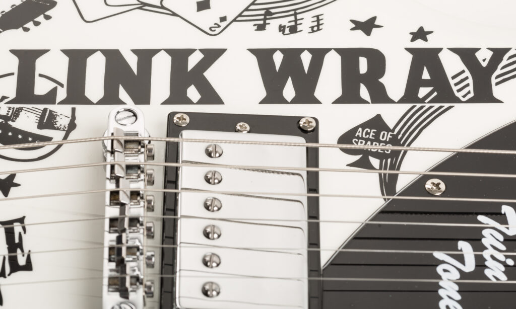 Die Eastwood Link Wray erscheint mit einem relativ gerade ausgeschnittenen Cutaway, wogegen die Korpuskanten eine angenehme Abrundung erfahren haben. Der Korpus besteht aus Linde und verleiht der Gitarre dadurch einen sehr luftigen Natursound und mit 3,2 kg ein sehr komfortables Gewicht. Die Lackierung des Bodys ist Weiß, wobei der in London ansässige Grafiker Vince Ray sowohl Decke als auch Boden in Lowbrow-Popart veredelte, die zum Teil Link Wrays Songtitel beinhalten. Die Motive mögen zwar Geschmackssache sein, fügen sich für mein Empfinden jedoch nahtlos in das Gesamtbild und die Konzeption der Gitarre ein und wirken irgendwie authentisch. In der unteren Hälfte des Korpus sehen wir das ebenfalls schwarzweiß gehaltene Schlagbrett, das sich bis um den Halspickup windet. Unmittelbar unter dem Pickuprahmen erfährt das Pickguard eine Erhebung, die wohl eher optische als funktionale Bedeutung hat. Zwischen den Pickups sieht man den Schriftzug “Twin Tone”, was möglicherweise eine Anlehnung an das Dual-Tone-Modell von Supro sein soll, die für die Link Wray Pate stand.