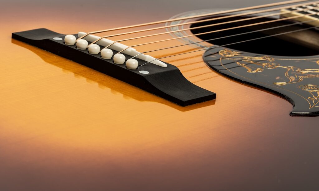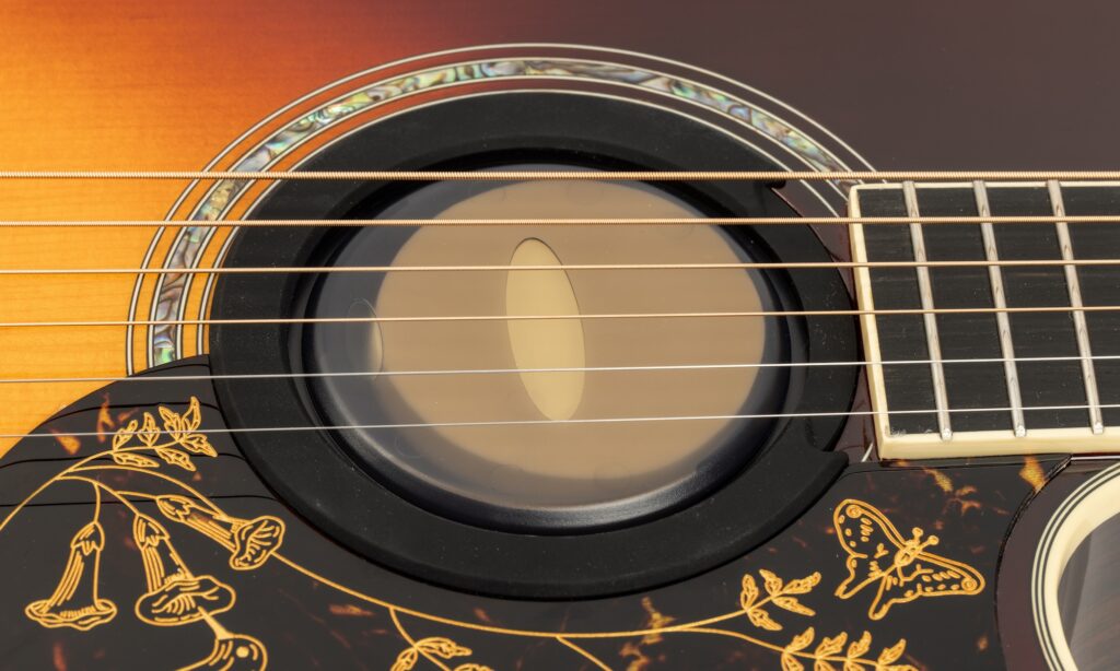 Die originale Gibson Hummingbird kommt bekanntlich mit einer Fichtendecke und einem Mahagonikorpus. Die Hummingbird Deluxe EC setzt hingegen auf eine andere bewährte Kombination und paart die Fichtendecke mit einem Korpus aus Palisander. Wie bei allen Instrumenten der neuen Inspired by Gibson Custom Acoustic Collection wird die Decke ab Werk thermisch behandelt, was einer schnelleren Entwicklung des Klangholzes zugutekommen soll. Und auch wenn die Decke wohl den größten Einfluss auf das Klangverhalten einer Akustikgitarre hat, ist die Wirkung des Korpusholzes ebenfalls nicht zu unterschätzen, wie ich erst kürzlich beim Vergleichstest zweier Gibson J-45 Modelle feststellen konnte. Ansonsten präsentiert sich die moderne Hummingbird mit einem opulenten Outfit, inklusive des typischen Kolibiri-Schlagbretts, einem mehrlagigen Binding und schicken Einlegearbeiten. Der Cutaway sorgt zudem für eine bessere Erreichbarkeit der hohen Lagen.