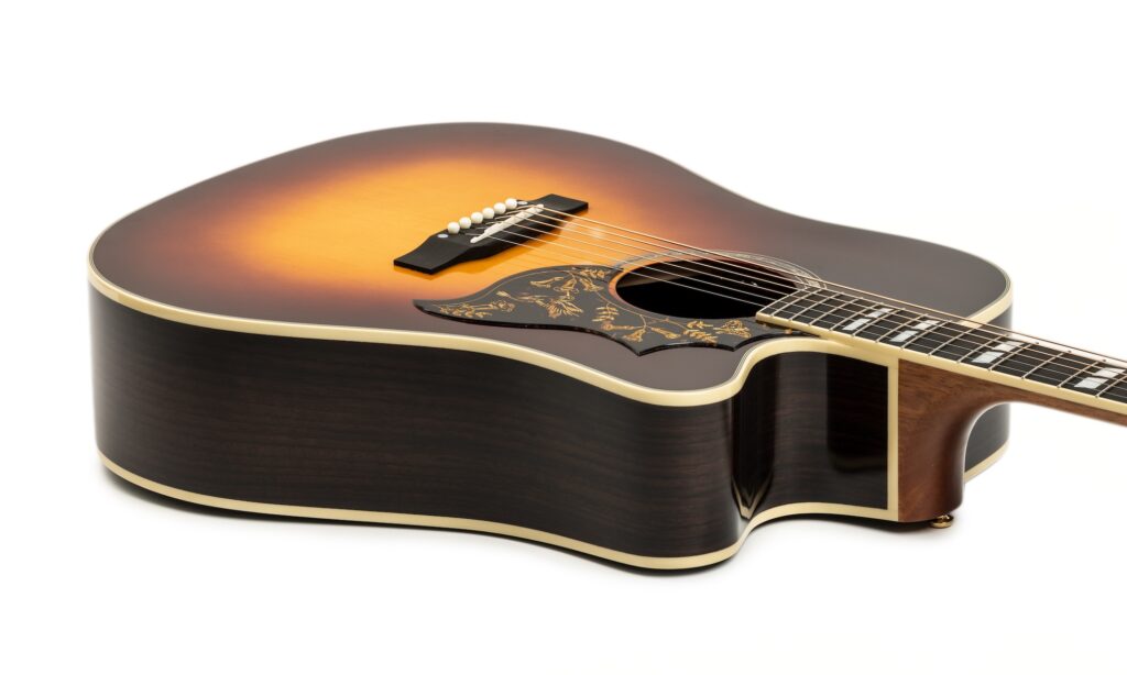 Die Epiphone Hummingbird Deluxe EC stellt eine Ausnahme in der aktuellen Inspired by Gibson Custom Acoustic Collection des Herstellers dar. Denn alle weiteren Modelle der Serie, wie beispielsweise die 1957 SJ-200 Reissue oder die 1942 Banner J-45 Reissue, orientieren sich sehr sorgsam an berühmten historischen Vorbildern des Mutterkonzerns. Die vorliegende Hummingbird Deluxe EC wiederum greift zwar das Design der legendären Square Shoulder Dreadnought auf, versteht sich aber als moderne Interpretation mit Cutaway und abweichender Holzauswahl. Inwiefern sich dies im Klang niederschlägt, wollen wir nun herausfinden.