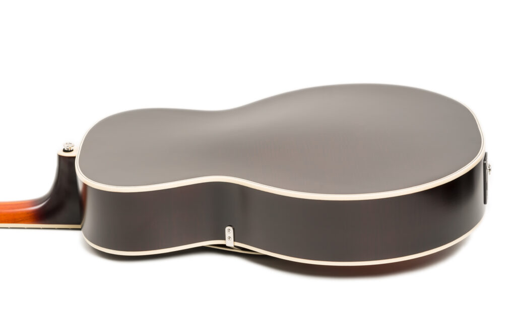 Die ansehnliche massive Fichtendecke ist aus zwei Teilen zusammengefügt. Die beiden Hälften ergeben ein symmetrisches Faserbild mit typischen feinstrukturierten Maserungen, wobei die Verleimstelle in der Mitte gut mit bloßem Auge erkennbar ist. Die Vintage-Sunburst-Lackierung (VS) steht der Decke jedenfalls gut zu Gesicht. Zwei Lackschichten, eine schwarz-braun-deckende am Korpusrand und eine durchscheinende klare im Zentrum bilden einen fließenden Übergang. Abschließend wurde die Oberfläche mit einer dünnen Schicht Mattlack versiegelt, die vom authentisch ausladenden Schlagbrett geschützt wird, das dem aus den 30er Jahren zumindest gleicht. Allerdings besteht das aktuelle aus einem Schildpatt-ähnlichen Imitat.