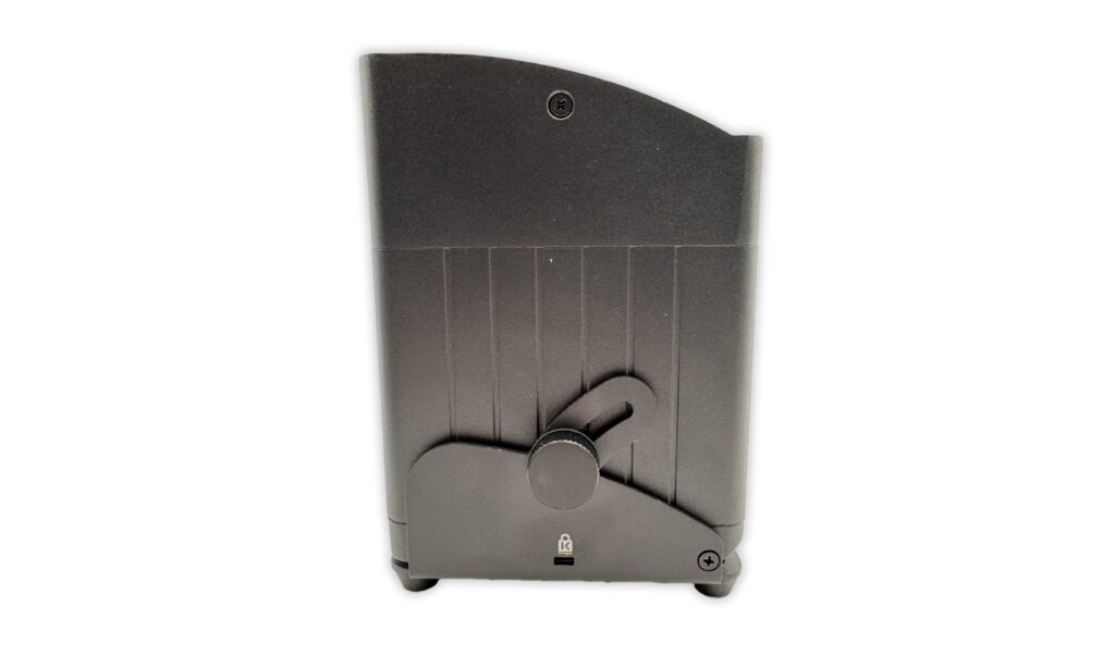 Die Vorderseite des Geräts wird von einem großen, silbernen Powerschalter, einem Display und vier Touch-Buttons dominiert. Weiß auf schwarzem Grund prangt hier außerdem die Hersteller- und Modellbezeichnung, die das ansonsten unauffällige, matte Gehäuse optisch auflockert. Ebenfalls integriert ist eine kleine Buchse zur Stromversorgung und Akkuladung, die ordnungsgemäß mit einer Verschlusskappe geschützt ist. Die Rückseite der Lampe weist keine besonderen Features auf.