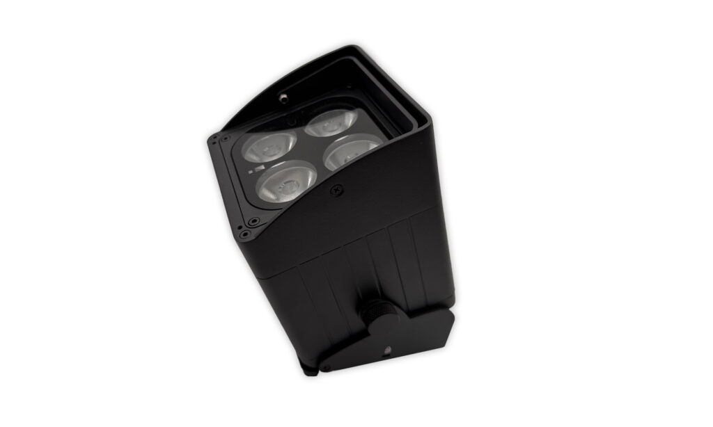 Von oben betrachtet sticht sofort die Anordnung der vier Leuchtmittel ins Auge, die quadratisch auf einer Scheibe platziert und vor Außeneinflüssen geschützt sind. Zwei Gewinde in der Gehäusefront dienen zur Befestigung des mitgelieferten Frostfilters mittels der beiden Schrauben. Zusätzlich sind die Lampen halbseitig durch eine Gehäuseseite abgeschirmt, was gezielte Lichtakzente erleichtert. Hier wurde ebenfalls ein Klapp-Griff installiert, welcher den Transport vereinfacht und dann wieder unauffällig verschwindet.