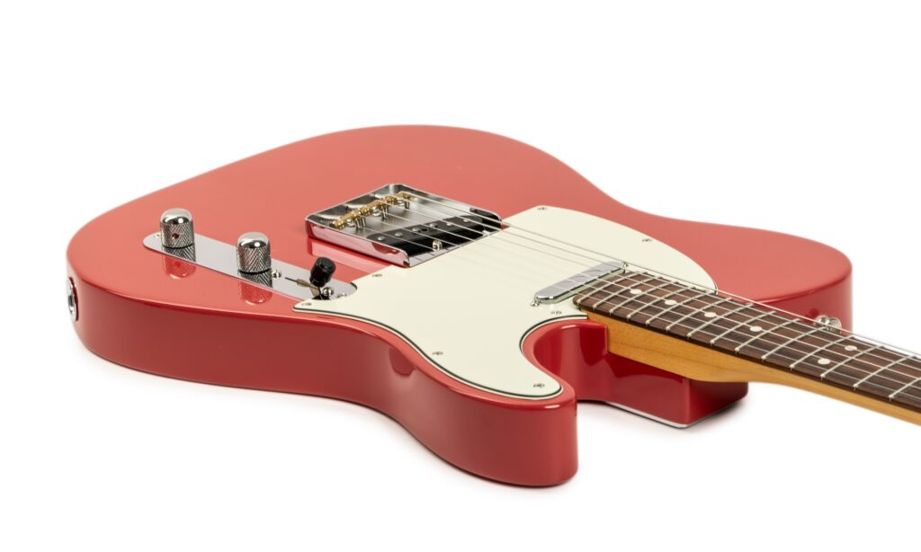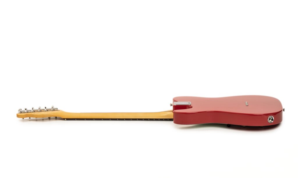 Die Fender American Professional Classic Telecaster zeigt sich mit einem Erlekorpus im Faded Dakota Red Finish. Die hochwertige Verarbeitung hinterlässt einen exzellenten Gesamteindruck, und mit einem Gewicht von nur etwa 3,36 kg ist das Instrument angenehm rückenschonend. Der geschraubte Ahornhals ist mit einem Griffbrett aus Palisander (Rosewood) versehen. Mit der Tele-typischen Mensur von 25,5″ (648 mm) und einer Sattelbreite von 1,685″ (42,8 mm) bietet die Gitarre die vertrauten Maße. Das Modern C-Profil des Halses liegt hervorragend in der Hand und sorgt in Kombination mit dem 9,5″-Griffbrettradius und den 22 Medium-Jumbo-Bünden für ein komfortables Spielgefühl.