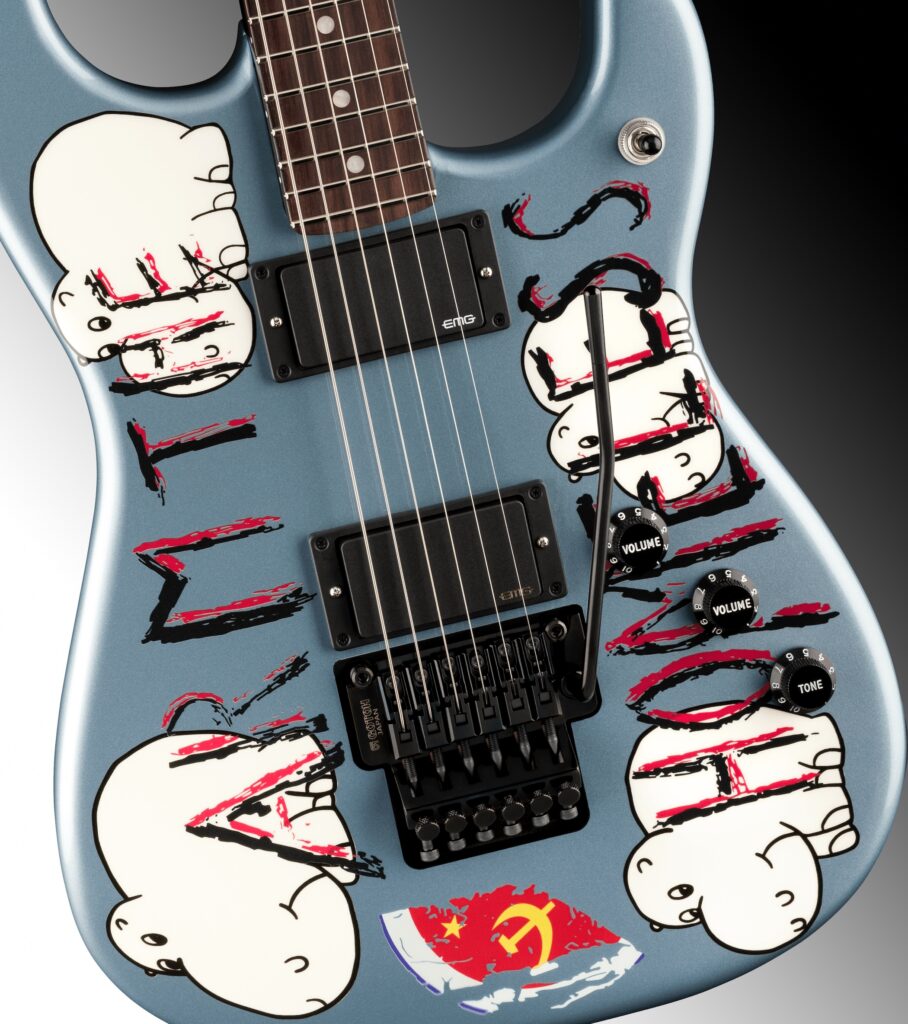 Die Fender Tom Morello Arm The Homeless versteht sich als Replik des Originals. Der gewohnt ergonomische Strat-Korpus besteht aus Erle und kommt ohne Schlagbrett aus. Er ist vierfach mit einem schwarz lackierten Ahornhals mit flachem C-Profil verbunden, der durch seine abgewinkelte Kopfplatte auffällt. Das Griffbrett mit 15″-Radius besteht aus Palisander und verfügt über 22 Medium-Jumbobünde, weiße Dot-Inlays und einen Klemmsattel. Die Basislackierung in Polyester erfolgt in Ice Blue Metallic. Dazu kommt die markante Beschriftung „Arm The Homeless“, mehrere Hippo-Zeichnungen und ein abgewetzter Aufkleber mit Hammer und Sichel.