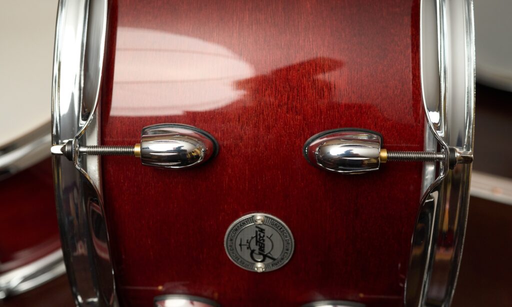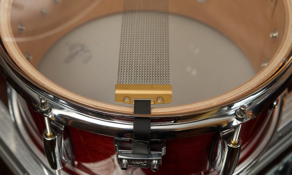 Das 13“ x 6“ Modell hat nur sechs Spannschrauben pro Seite, die 14″ x 5″ hat eine 8er-Teilung. Die sonstige Hardware entspricht in weiten Teilen den Gretsch Catalina Drums. Alle Anbauteile sind verchromt. Die Teppichabhebung verrichtet bei allen vier Trommeln problemlos ihren Dienst, ebenso laufen alle Stimmschrauben makellos. Somit ist es ein Leichtes, die Trommeln durchzustimmen. Lediglich die nicht überall perfekt runden Spannreifen – an allen Modellen sind dreifach geflanschte 2,5mm-Ausführungen montiert – trüben das Bild etwas. Auch fällt auf, dass der 20-spiralige Teppich der 14x5er die Reise nicht ganz unbeschadet überstanden hat. Er klingt etwas rappeliger als die anderen drei Modelle. Statt der Doppelspannböckchen, die alle drei anderen Modelle haben, schraubt Gretsch beim 14“ x 8“ Modell 20 Catalina Mini Lugs an den Kessel.