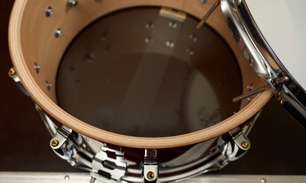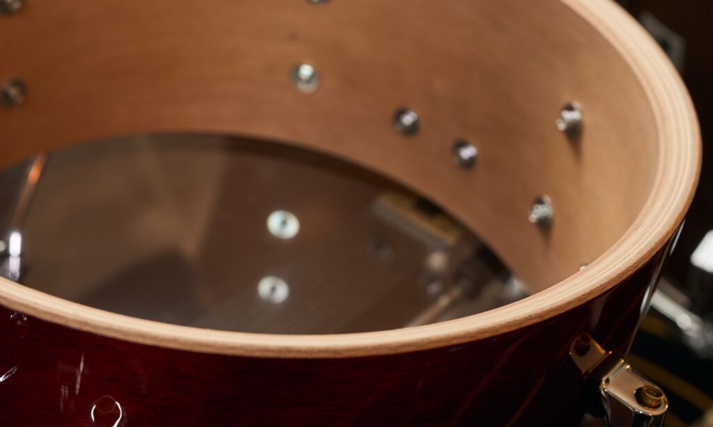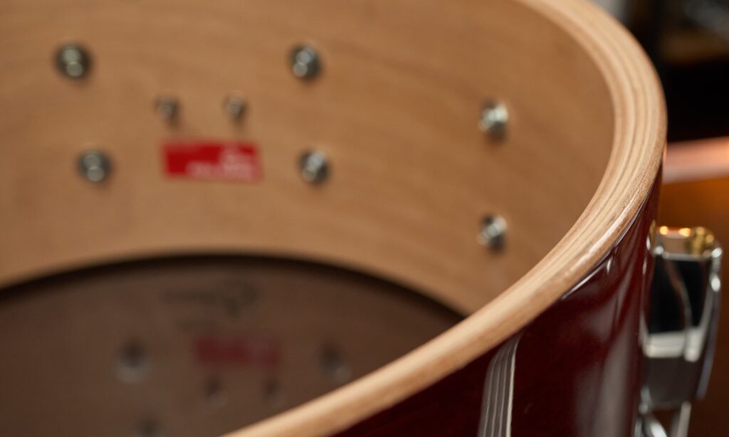 Im Gegensatz zu den eher schlanken Full Range Birch Snares besitzen unsere Testmodelle einen ca. 13mm starken Kessel, der aus 16 Lagen Ahorn und Mahagoni besteht – was beim Blick unter die Haube auf jeden Fall imposant aussieht. Die Kessel sind auf der Außenseite hochglanzlackiert und wirken so auch auf den zweiten Blick deutlich hochpreisiger, als sie es in Wahrheit sind.