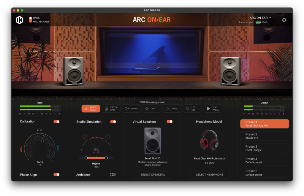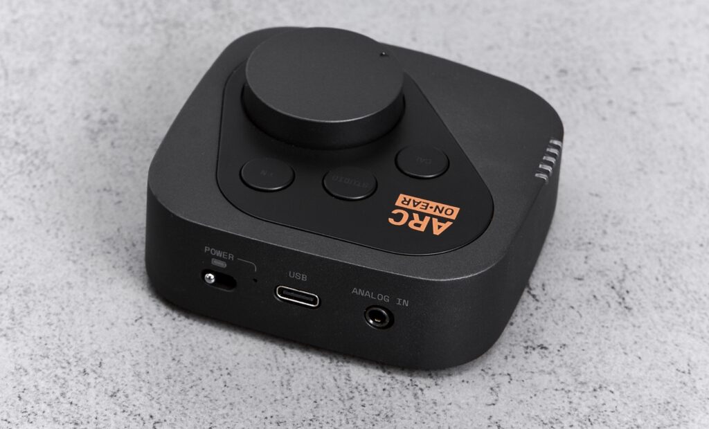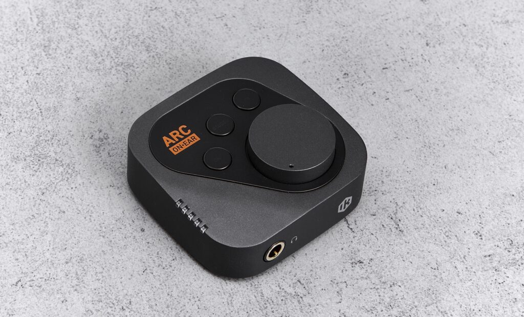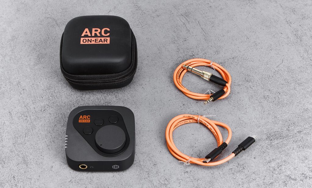 Bei der Hardware des ARC ON-EAR handelt es sich um eine kompakte und transportfreundliche Box, die entweder per USB oder analog im Akkubetrieb verwendet werden kann. Die Optimierung des Kopfhörerklangs erfolgt über drei (jeweils deaktivierbare) Modi.