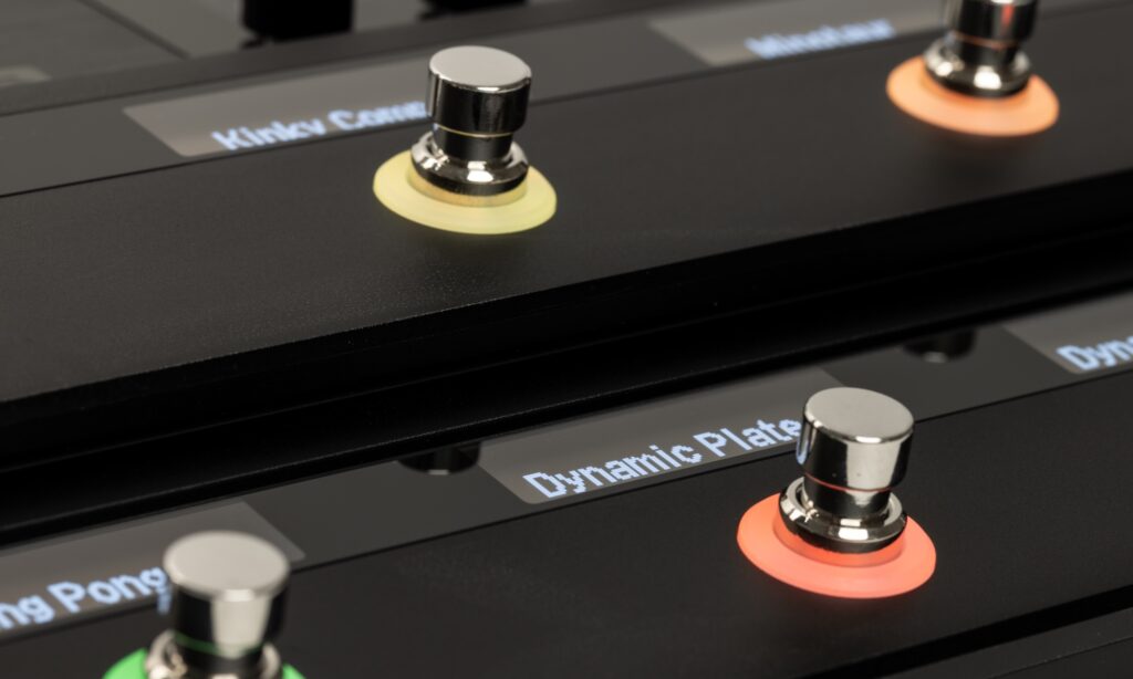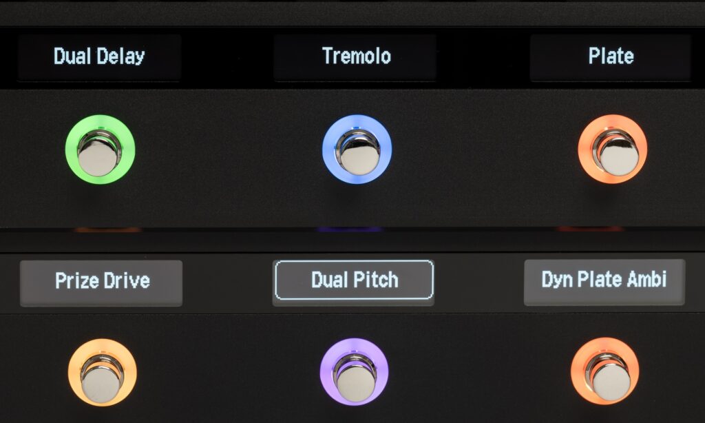 … und auch ohne Editorprogramm ist man schnell am Ziel. In der unteren Reihe finden sich 12 Fußtaster mit Touch-Funktion, LED-Kranz und die davor liegenden Scribble-Strips, in denen die Funktion des Tasters dargestellt wird. Eine clevere Hilfe, wenn sich die Parameter eines Tasters je nach Preset ändern können. So behält man auch dann den kompletten Überblick, wenn man zum Beispiel einen neuen Effekt in ein Modul lädt. Sofern noch ein Fußtaster frei ist, wird der Effekt diesem sofort zugewiesen. Auch das spart Zeit beim Programmieren. Ganz rechts befindet sich ein solides Expression-Pedal, das zwei Funktionen steuern kann. Ab Werk ist es als Volume-Pedal vorprogrammiert. Drückt man es etwas fester in die Toe-Position, wird die zweite Funktion aktiviert, zum Beispiel ein Wah-Effekt.