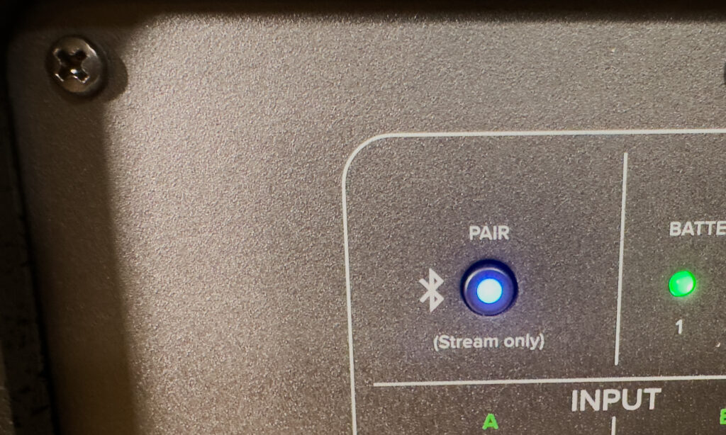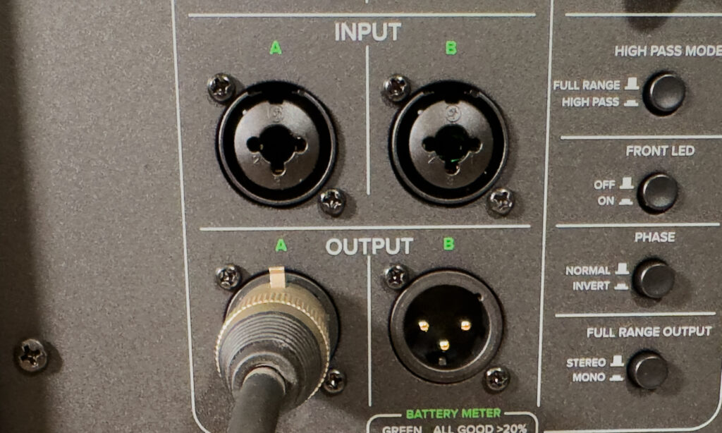 Die Anschlüsse und Bedienelemente des aktiven Thump Sub GO sind auf der Rückseite angeordnet. Hier bietet unser Testkandidat zwei Audioeingänge in Form von XLR/6,35-mm-Klinke-Kombobuchsen und auch zwei XLR-Ausgangsbuchsen. Oberhalb der Eingangsbuchsen sind der Bluetooth-Sync-Button mit blauer Verbindungs-LED sowie die beiden Akku-Status-LEDs platziert. Das Volume-Poti im rechten oberen Bereich ist ebenfalls mit einer Clipping-LED ausgestattet. Unterhalb des Volume-Potis verfügt der Speaker über je einen Schalter zum Aktivieren des High-Pass-Modes, zum Ein-/Ausschalten der Front-LED, zum Drehen der Phase sowie zur Auswahl des Mono-/Stereo-Modus des Mackie Thump Sub GO.