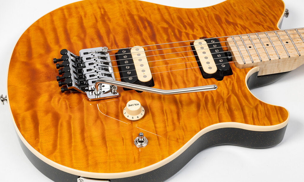 Der fünffach verschraubte Hals besteht ebenso wie das eingefasste Griffbrett aus geflammtem Ahorn. Letzteres bietet einen 10″-Radius, 22 Medium-Edelstahlbünde und schwarze Dot-Inlays. Das asymmetrische Halsprofil ist in Richtung der hohen Saiten flacher ausgearbeitet und soll so eine besonders komfortable Bespielbarkeit ermöglichen.