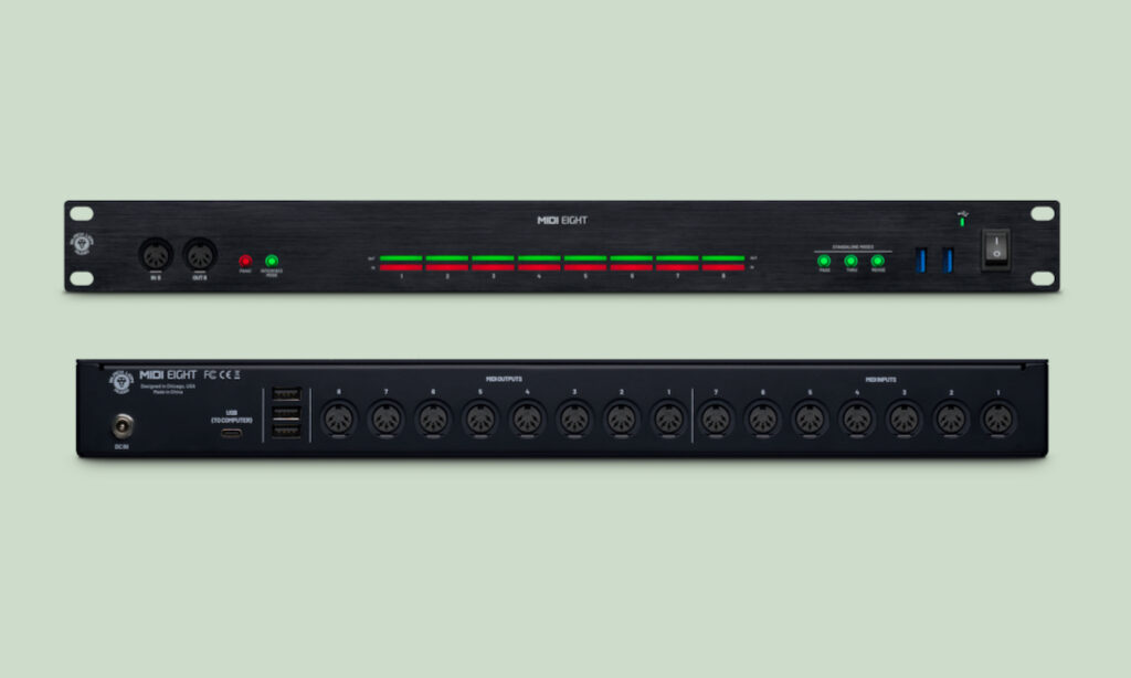 Beim MIDI Eight handelt es sich um ein MIDI-Interface mit acht MIDI-DIN-Eingängen und acht entsprechenden Ausgängen, die auf der Rückseite zu finden sind. Die Platzierung des MIDI-Anschlusses 8 ist auch auf der Front zu finden und erlaubt es, Geräte in den bestehenden Workflow spontan einzubinden. Eine LED-Anzeige auf der Frontseite visualisiert sämtliche MIDI-Aktivitäten in Echtzeit und erleichtert die Kontrolle aller Signale. Das Gerät kann Standalone und mit dem Computer genutzt werden.