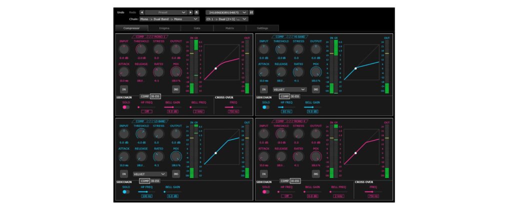 Der Kompressor ist vierkanalig! Zwar können immer nur zwei Kanäle übner die Front direkt gesteuert werden, doch dafür gibt es interessante Verschaltungsmöglichkeiten, zum Beispiel eine serielle Anordnung.