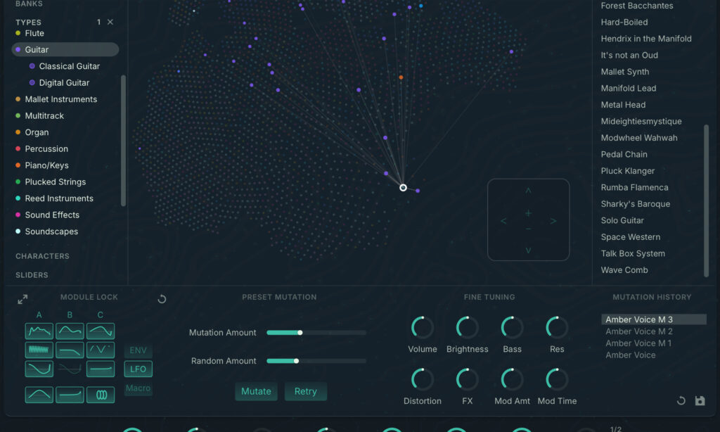 Absynth 6 bringt zunächst 415 frische Presets mit und übernimmt zusätzlich rund 1.600 Sounds aus den Vorgängern. Die wachsende Klangsammlung durchstöbert man im neu gestalteten Preset-Browser, dessen Punktwolke stark an die Sample-Browser von Atlas oder XLN Audio XO erinnert.