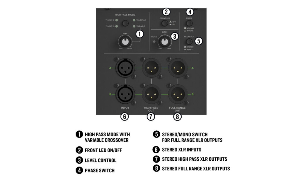 • integrierter DSP mit: High Pass Modes (Thump 12, Thump 15, Thump Go, variabel)