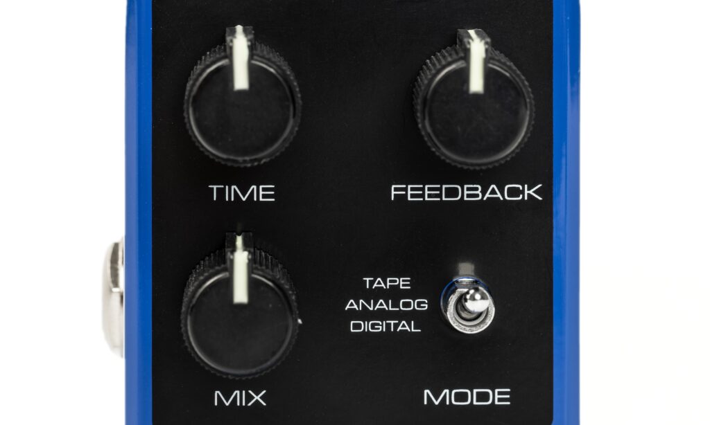 Das sitzt in einem kompakten blauen Gehäuse mit den Maßen (BxHxT) 50 x 52 x 92 mm, bringt 195 Gramm auf die Waage und lässt sich bei Bedarf mit vier auf der Unterseite ausklappbaren Mounty-P-Montageplatten auf einer Unterlage (Pedalboard) befestigen. Zu den Bedienelementen auf der Oberseite gehören drei Potis für den Effektanteil (Mix), die Delay-Geschwindigkeit (Time) und die Anzahl der Wiederholungen (Feedback), während ein kleiner Kippschalter die drei Betriebsmodi Digital, Analog und Tape anwählt. Die Delay-Modi werden dabei über unterschiedliche LED-Farben (Digital = blau, Analog = rot, Tape = grün) angezeigt und orientieren sich klanglich an den Echo-Kategorien Digital-Delay, BBD-Analog-Delay und Bandecho.