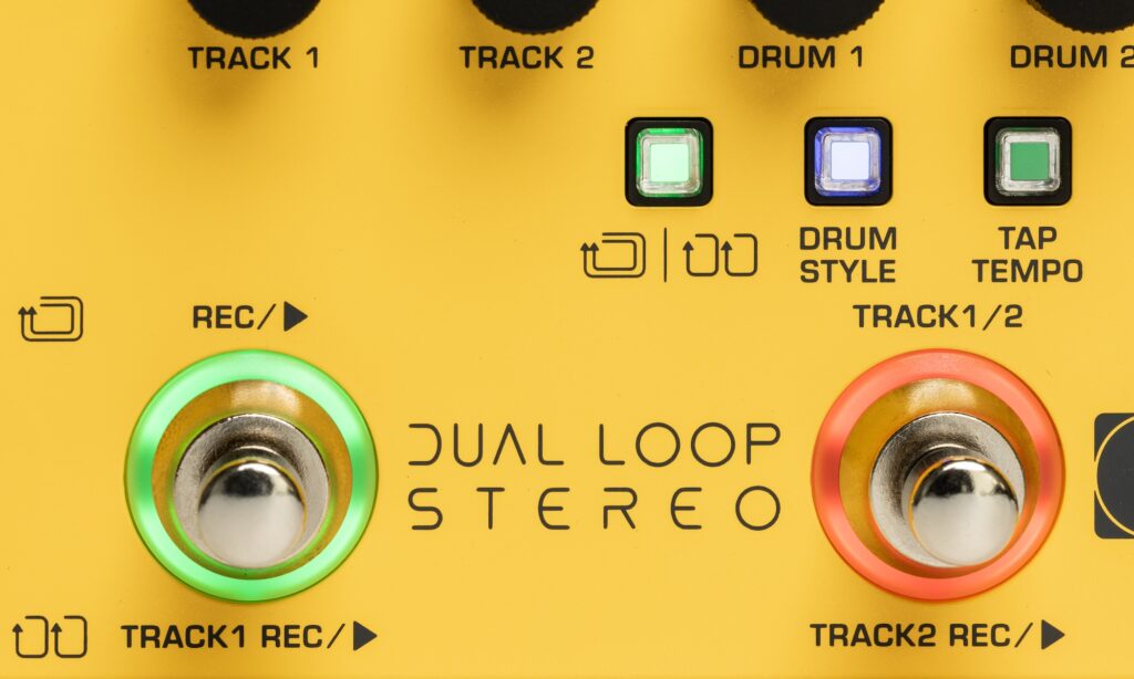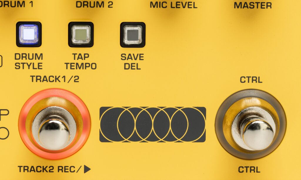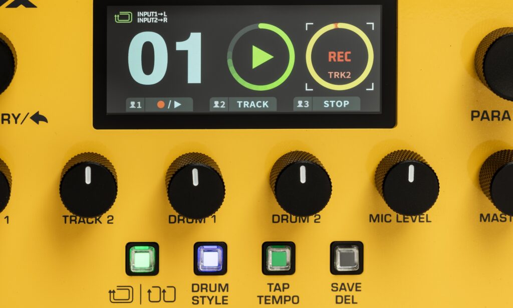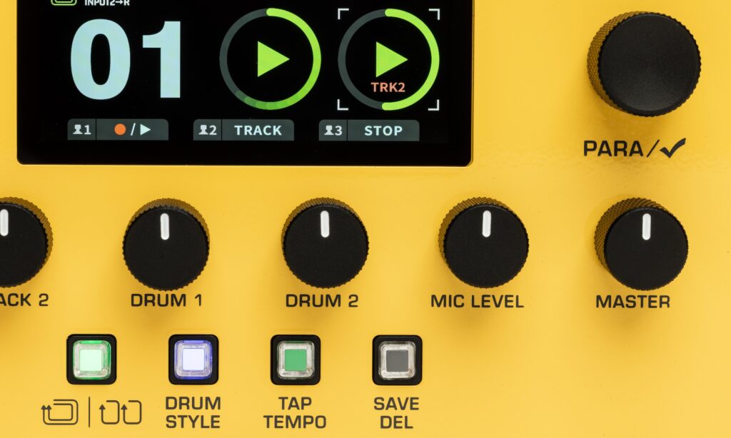 Das Kernstück der Bedienoberfläche bildet ein 70 x 28 mm großes farbiges LCD-Display mit einer Auflösung von 960 x 376 Pixel. Die drei soliden Fußtaster mit Relais-Schaltung sind mit einem LED-Kranz ausgestattet, der Auskunft über den jeweiligen Status gibt. Davor befinden sich vier kleine Taster mit integrierter LED (Sync/Split, Drum Style, Tap Tempo, Save/Delete). Unter dem Display bieten sechs Regler den direkten Zugriff auf die Lautstärken von Track 1, Track 2, Drum 1, Drum 2, Mic Level und Master. Neben dem Display sind rechts und links Encoder mit Tastfunktion zum Einstellen der wesentlichen Parameter positioniert.