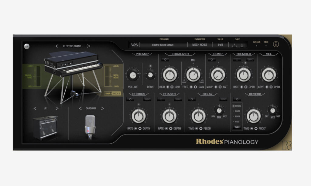 Um den Klang anzupassen, stehen Klavier-Kompressoren, EQ, Modulation, Delay, Stereo-Tremolo, Panning sowie eine Auswahl an Rhodes-Reverbs zur Auswahl. Der Tremolo-Effekt basiert auf der Schaltung des Vintage Grand. Velocity-Kurven und Velocity-Deph erlauben die Anpassung an die individuellen Spieltechniken der Musiker.
