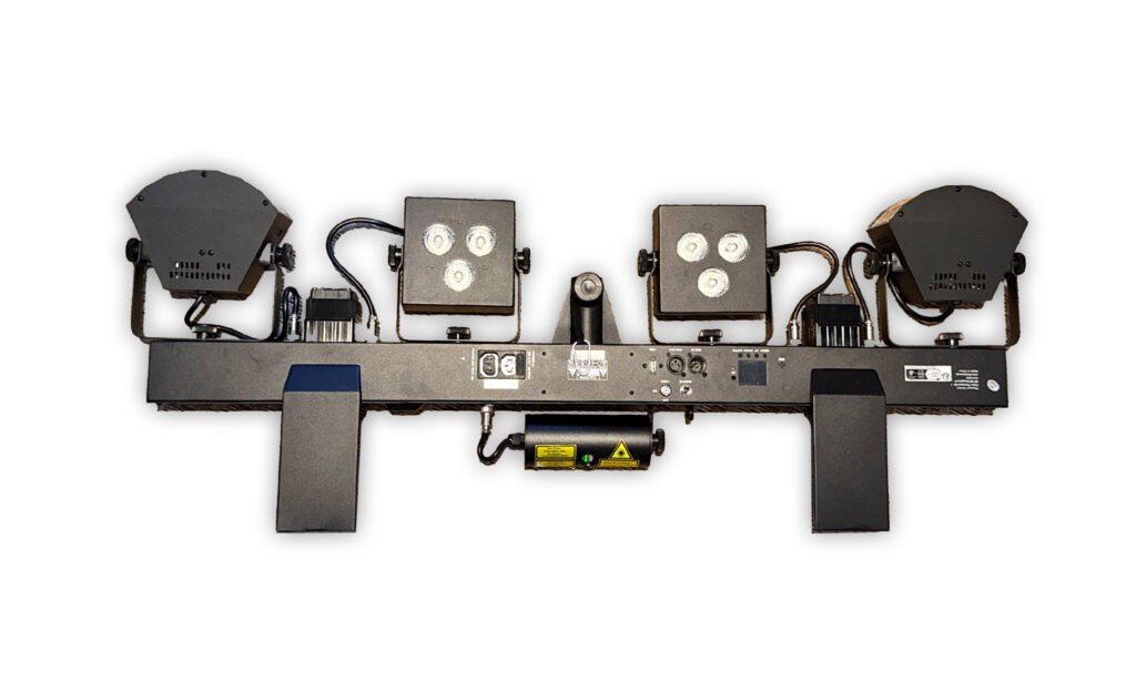 Vier weitere Lampen befinden sich auf der Unterseite der Bar: Außen sind dort die beiden Derbys zu nennen, dazwischen zwei PAR-Scheinwerfer mit jeweils drei RGB-Leuchtmitteln. Alle unterseitigen Leuchtkomponenten sind ausrichtbar und über zwei seitliche Schrauben festzustellen. Mittig ist ein 35-mm-Flansch zu finden, der über das mitgelieferte Stativ gestülpt und ebenfalls mittels einer Drehschraube fixiert werden kann. Außerdem sind auf der Unterseite zwei Lüfter zur Gerätekühlung angebracht.