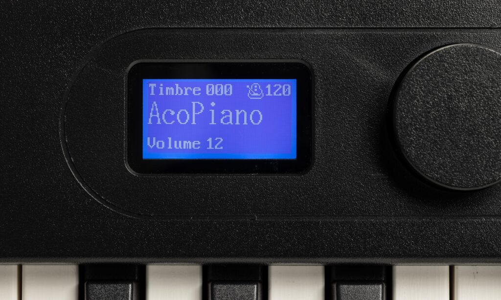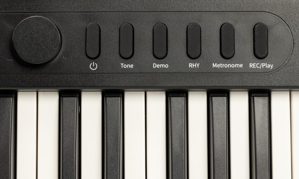 Das Bedienfeld des Startone FP-90 kommt mit 6 gummierten Knöpfen und einem Drehregler aus. Durch das reduzierte Konzept reichen diese Bedienelemente auch völlig aus. Neben dem On/Off-Schalter dienen die weiteren Knöpfe zum Auswählen der 128 Klänge bzw. 128 Rhythmen sowie dem Abspielen der Demos und des Metronoms. Das FP-90 bietet außerdem einen ganz einfachen MIDI-Recorder zum Aufzeichnen und Abspielen eigener Kreationen.