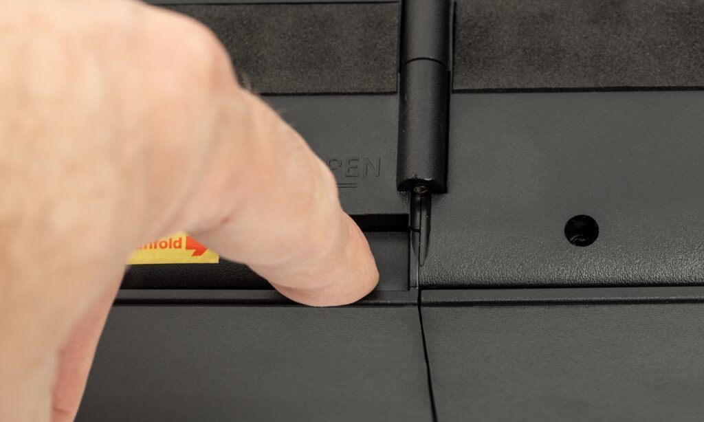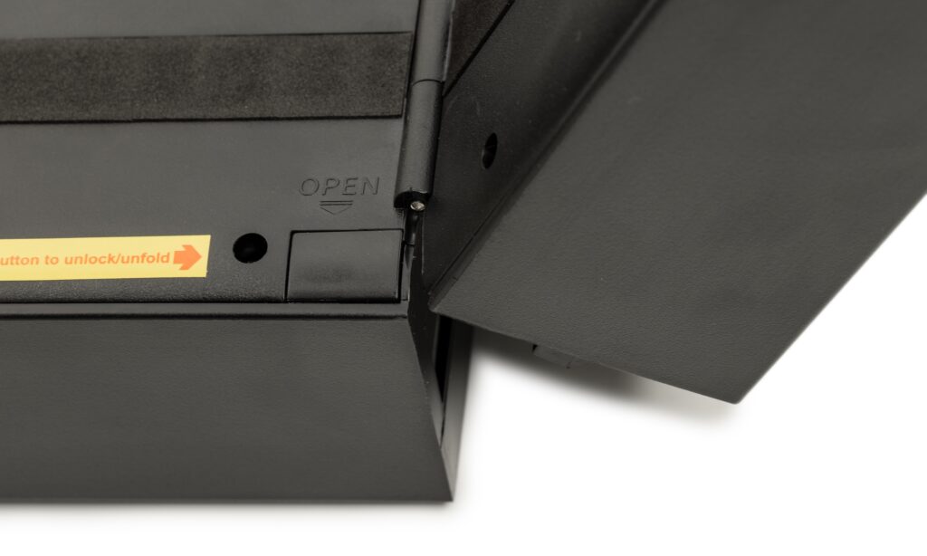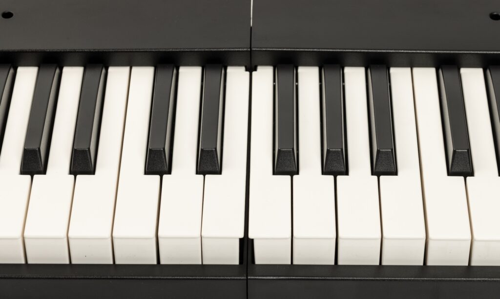 Nach dem Auspacken zeigt sich: unser Testkandidat lässt sich exakt in der Mitte falten! Über ein Gelenk sind die beiden Piano-Hälften miteinander verbunden und beim Ausklappen rastet ein Haltemechanismus, um die nötige Stabilität zu garantieren. Auch das Zusammenklappen funktioniert ganz einfach: mittels Schalter auf der Rückseite wird der Riegel für die Arretierung gelöst, und das Piano kann ganz leicht gefaltet werden.
