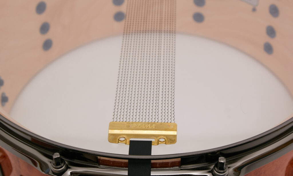 Für die S.L.P. Reihe können die Tama-Konstrukteure aus einem ansehnlichen Fundus an verschiedenen Kessel-Hardware-Optionen wählen. Im Falle der Testtrommel hat man sich für insgesamt 20 der bekannten Starclassic-Einzelspannböckchen entschieden, welche in Kombination mit den 2,3 Millimeter starken Steel Mighty Hoops (Stahlspannreifen) für eine saubere Stimmung sorgen sollen. Apropos Stimmung: Damit die Snare das gewählte Tuning möglichst lange hält, wurden die Stimmschrauben mit den speziellen Tama Hold Tight Washers versehen, bei denen es sich um eine Art kunststoffgefüllte Metallunterlegscheiben handelt. Solche Details erfreuen das Testerherz und machen das Leben des Working Drummers leichter. Auch bei der Abhebung wurde nicht gespart. Obwohl sich bekanntermaßen auch mit sehr schlichten, einseitig justierbaren Konstruktionen gut arbeiten lässt, kommt der Besitzer der neuen G-Maple Snare in den Genuss der beidseitig einstellbaren MLS50 Abhebung. Gerasterte Drehräder sollen die gewählte Teppichspannung auch unter harten Schlägen halten, und das per Stimmschlüssel abnehmbare Butt End erübrigt die Demontage des Teppichs beim Wechsel des Resonanzfells. Mit Ausnahme des Luftausgleichslochs sind alle Metallteile schwarz eloxiert. Bei der Fellbestückung wählt Tama traditionell Evans, und so kommen hier G1 coated und Snare Side 300 Versionen zum Einsatz. Nicht begeistert bin ich vom Zustand des 20-spiraligen Snare-Teppichs, dieser weist nämlich deutlich unterschiedliche Spannungen einiger Drähte auf. Da andere S.L.P. Test-Snaredrums diesen Makel nicht aufwiesen und auch eine Beschädigung während des Transports nicht auszuschließen ist, sehe ich von einem Punktabzug in der Bewertung jedoch ab.