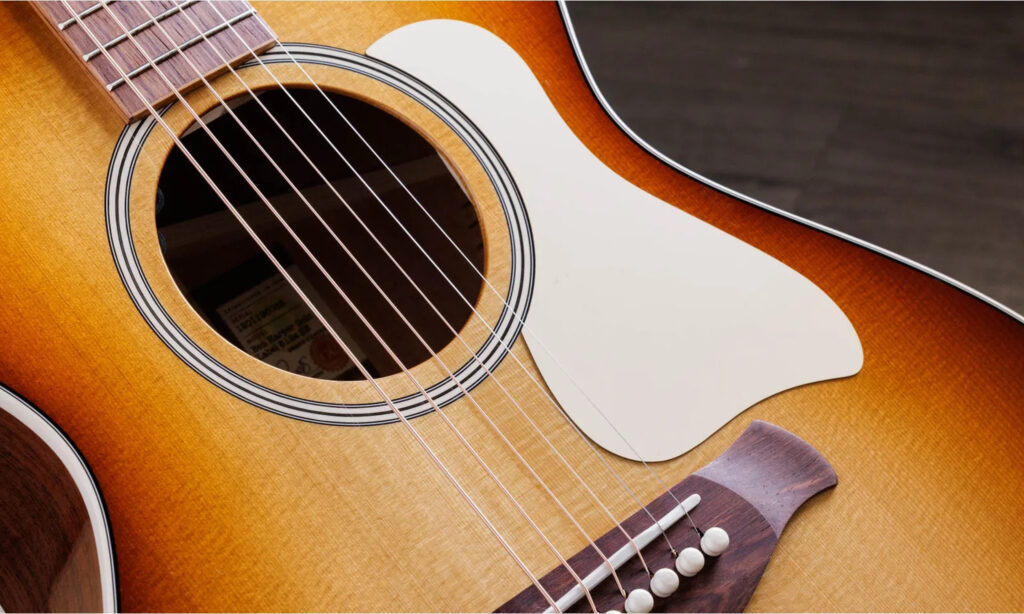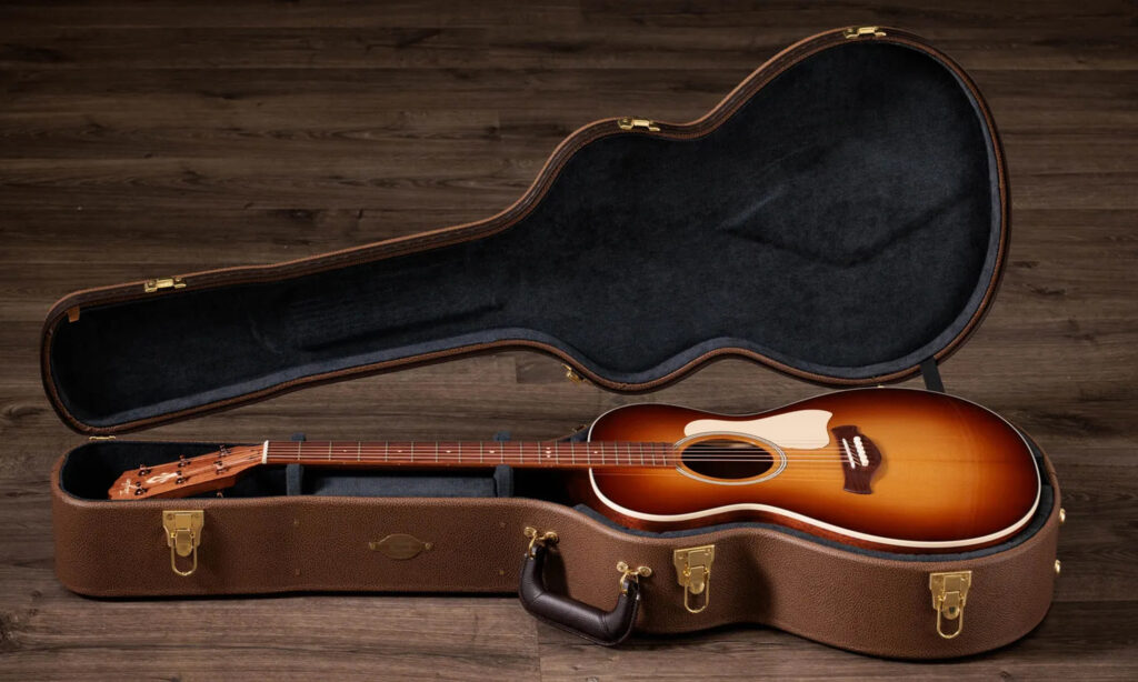Bei der Hardware setzt Taylor auf einen Palisandersteg sowie hauseigene Mechaniken in polierter Bronzeoptik. Die hochglänzende, transparente Lackierung unterstreicht die geschmackvolle Vintage-Optik. Die Edgeburst-Decke verleiht dem Instrument eine eigene Note, ergänzt durch ein cremefarbenes Schlagbrett.