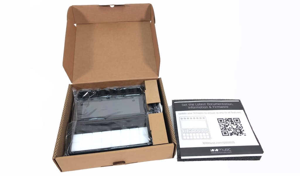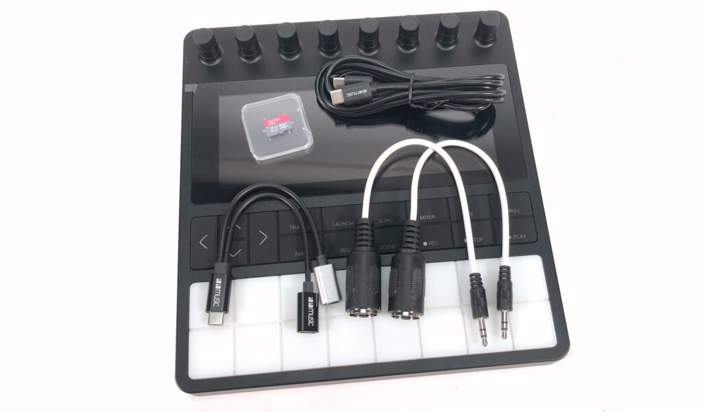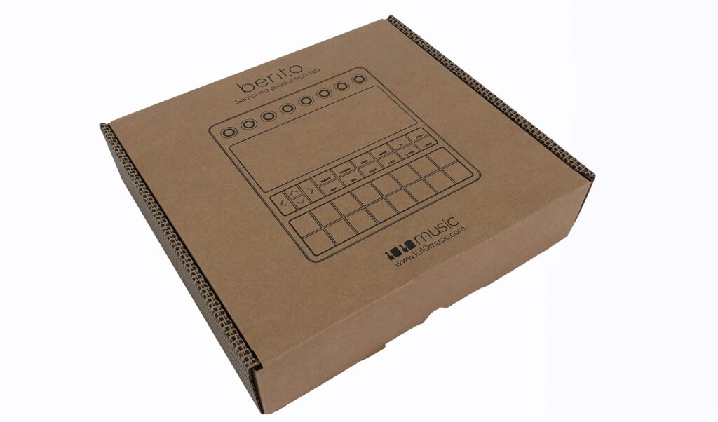 Schon die Kartonverpackung macht Lust aufs Auspacken. Im Lieferumfang enthalten sind neben der bento ein USB-C-Kabel, ein USB-Splitterkabel, zwei MIDI-Adapter und eine SanDisk Ultra 16 GB microSD-Karte, die in einem Slot an der rechten Gehäuseseite eingeschoben wird. Ein QR-Code lädt zum Firmware-Upgrade ein. Der Test begann mit Version 1.0.2 (sehr unausgereift) und endete mit Version 1.3.4 (durchaus appetitlich).