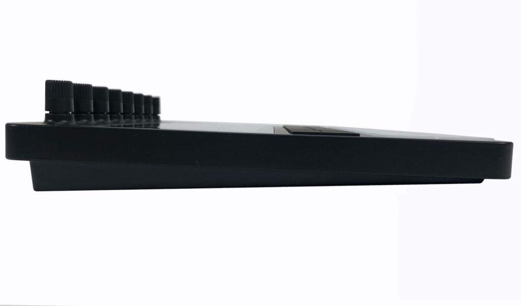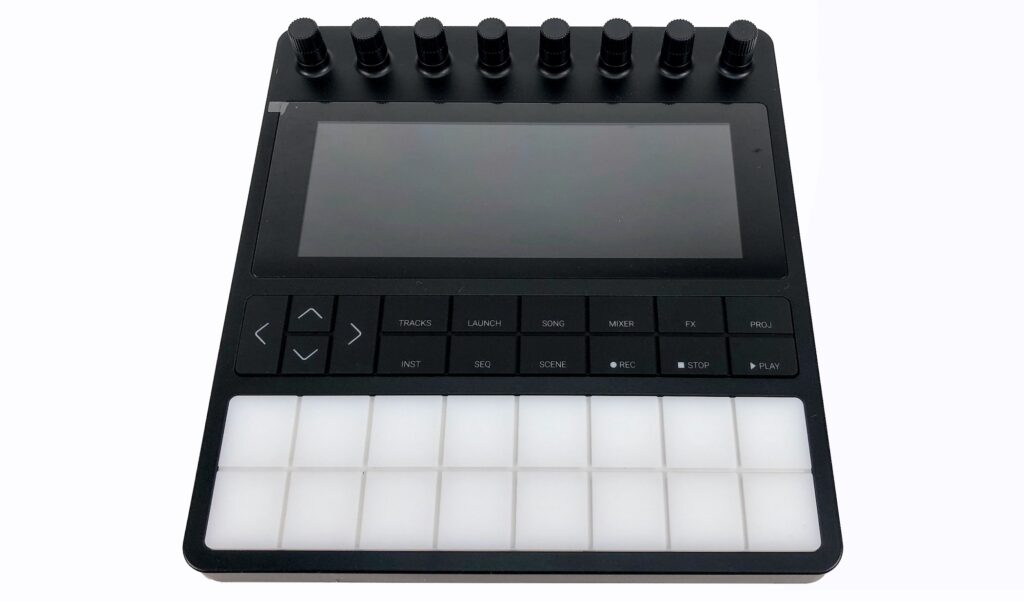 Die stylische Oberfläche wird mit 16 Gummitastern bedient, die hintergrundbeleuchtet beschriftet sind, sodass man auch auf dunkler Bühne alles im Griff hat. Über diese erreichen wir die Funktionsebenen wie Tracks, Launch, Song, Mixer, FX, Projekt, Instrument, Sequenz, Scene sowie die drei Transportbuttons für Record, Stop und Play. Bitte alle diese Begriffe gut merken, sie werden im Laufe des Tests noch abgefragt.