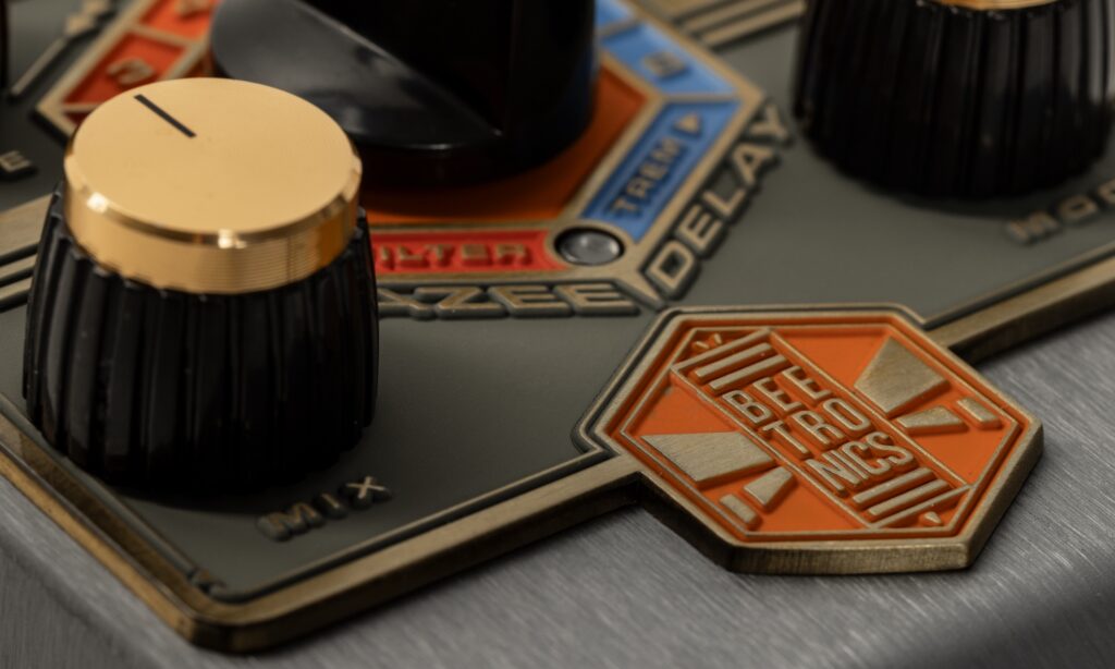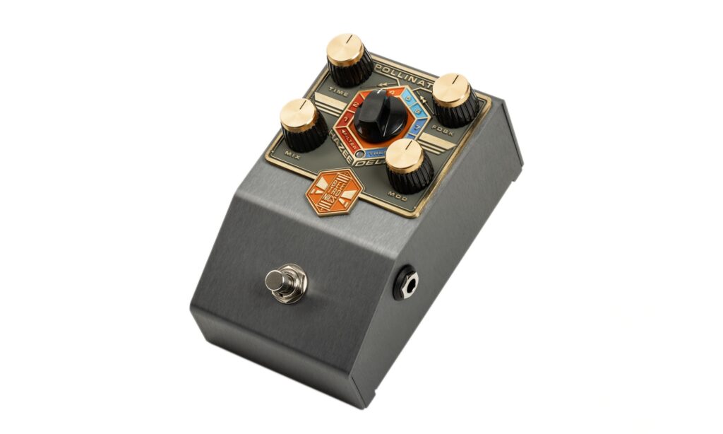 Unser Delay-Spezialist arbeitet vollständig digital und bietet insgesamt acht Effektmodi, die über einen mittig platzierten Drehstufenschalter angewählt werden. Eine MIDI-Anbindung fehlt allerdings, was insbesondere im Live-Betrieb das Arbeiten mit unterschiedlichen Einstellungen erschwert. Optisch präsentiert sich das Pollinator Hazee Delay im typischen Stil von Beetronics FX. Ein aufwendig gestaltetes Boutique-Gehäuse mit markanten Grafiken in einer soliden Metallkonstruktion. Die Bedienoberfläche ist intuitiv: Vier Potis sowie ein mittig platzierter Drehschalter mit acht Positionen übernehmen die komplette Organisation des Pedals.