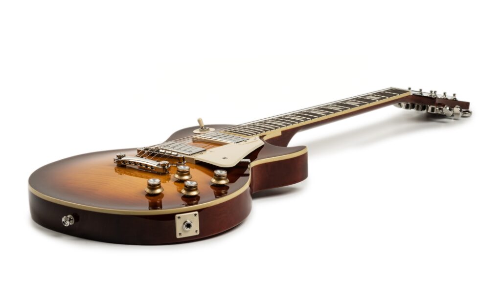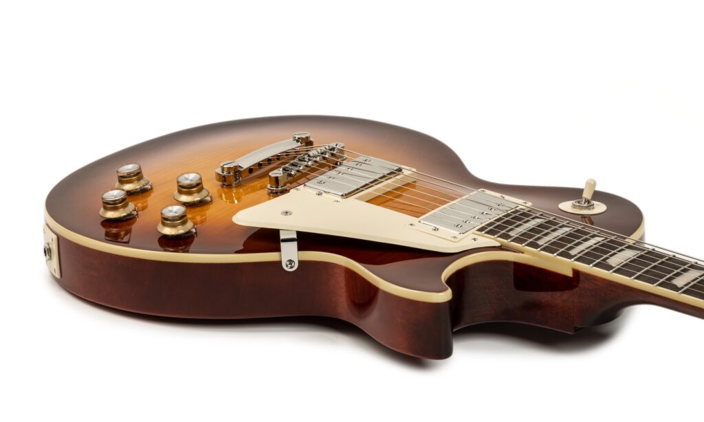 Die Tradition wird auch mit zwei Humbuckern, vier Reglern und einer Tune-O-Matic Bridge mit Stop-Tailpiece umgesetzt. Die Pickup-Kappen sind vernickelt, so wie die gesamte Hardware des Instruments. Als Brücke kommt eine Locktone ABR Tune-O-Matic mit einzeln verstellbaren Saitenreitern zum Einsatz, die sich mit einem Schraubendreher bequem in der Höhe verstellen lässt. Ausgeliefert wird die Gitarre in einem soliden Premium-Gigbag, das bei normalem Transport ausreichend Schutz bietet.