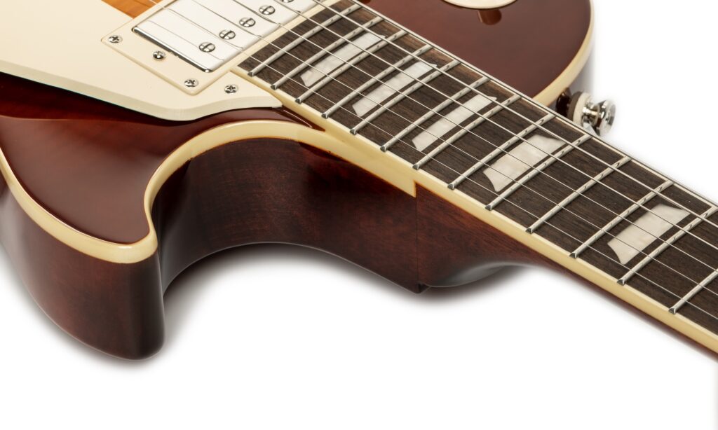 Die Gitarren der Epiphone Les Paul Standard 60s-Serie sind in mehreren Farben erhältlich, wobei die transparenten Finishes Ice Tea Burst und Blueberry Burst das attraktiv gemusterte Riegelahornfurnier der Decke durchscheinen lassen. Beim Ebony-Finish betont eine schwarze Decke den Mahagonikorpus und bei allen Ausführungen zieht sich ein cremefarbenes Binding auch an der Halskante entlang. Das Kunststoff-Schlagbrett sowie die Pickuprahmen und der Ring um den Kippschalter sind im gleichen Farbton gehalten.