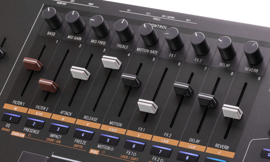 Ebenso praktisch sind der große Ribbon-Controller mit drei Zonen sowie jeweils neun Knobs und Fader plus zehn Buttons. Gerade mit den Fadern kann man intuitiv ins Klanggeschehen eingreifen. So lässt sich beispielsweise schnell einmal die Filterfrequenz oder Effekt-Intensität regeln, und bei Orgelsounds fungieren die Fader als Zugriegel.