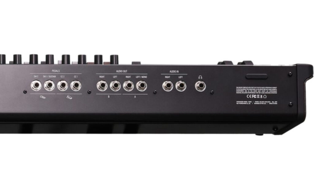 Auf der Rückseite sind die Standard-Anschlüsse zu sehen: Zwei Stereo-Ausgänge, ein Stereo-Eingang, MIDI In und Out (kein Thru), USB-MIDI, USB-Storage und natürlich eine Kopfhörer-Buchse. Externe Audio-Signale wie Vocals oder Live-Instrumente lassen sich einspeisen und bearbeiten. Ein USB-Audio-Interface integriert der K2088 aber nicht.