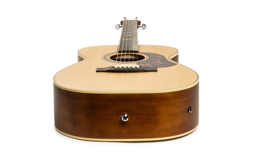 Der Korpus der Maton EBG808 fällt mittelgroß aus und entspricht in etwa dem Martin 00-Format, kommt aber mit einer recht ausladenden Zarge, wie man sie von der Dreadnought kennt. Typisch für ihre Größe offenbart sie damit eine schnelle Ansprache und klingt gleichzeitig größer, als man gemeinhin erwarten würde. Direkt ab Werk ist die EBG808 außerdem mit einem zweiten Gurtpin an der Rückseite des Halsfußes bestückt, was dafür sorgt, dass sie im Stehen leicht nach vorne kippt. Beim Spielen stört das aber nicht weiter.