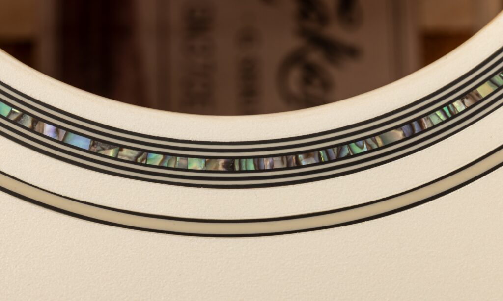Die in China gefertigte Takamine GN37CE PW liegt mit ihrem aktuellen Preis von rund 750 Euro schon im mittleren Preissegment und wird standesgemäß mit einer schlichten, aber sehr soliden Tasche inklusive großem Außenfach ausgeliefert. Das von einem cremefarbenen Ivory-Binding und goldener Hardware unterstrichene hochglänzende Perlweiß-Finish sieht man bei Westerngitarren definitiv nicht alle Tage. Die Fraktion der Folkpicker, Fingerstyler oder Acoustic-Rocker dürfte sich damit wohl eher nicht angesprochen fühlen. Aber im Schlager- und Volksmusik-Business könnte diese Aufmachung durchaus punkten – und das ist keinesfalls despektierlich gemeint. Auch wenn Geschmäcker bekanntlich verschieden sind, verwundert es mich dennoch ein wenig, dass die GN37CE tatsächlich nur in dieser Farbgebung angeboten wird.