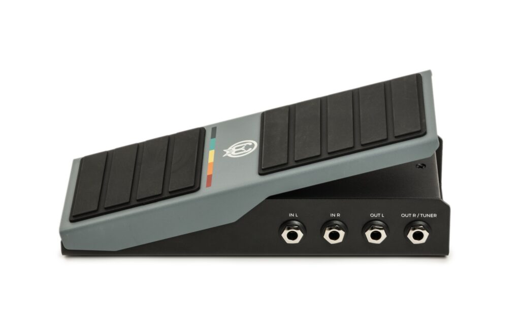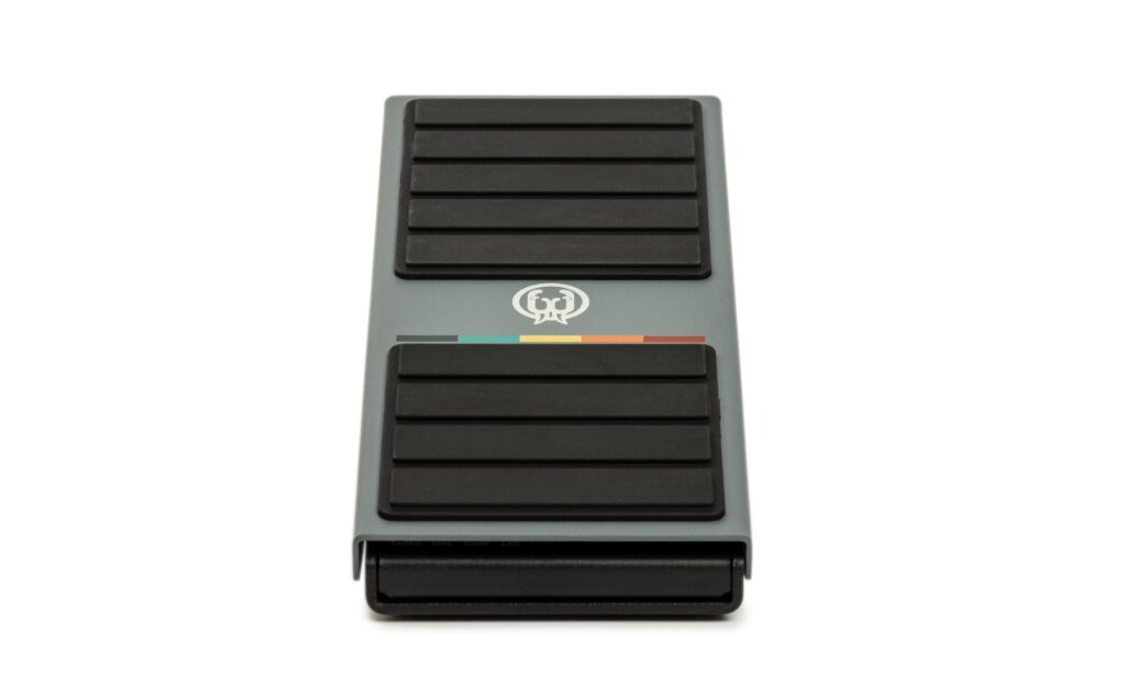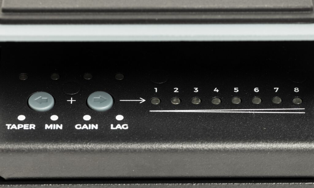 Alle weiteren Funktionen des Pedals sind unauffällig unter der Fersensektion der Wippe zugänglich. Sie gliedern sich in zwei Druckschalter zur Steuerung der Funktionen „Taper“ (8 Lautstärkekurven), „Minimum On“ (Lautstärke der Fersenposition), „Gain“ (Boost in der Zehenposition von -12 dB bis +9 dB) und „Lag“ (Verzögerung der Lautstärkebewegung).