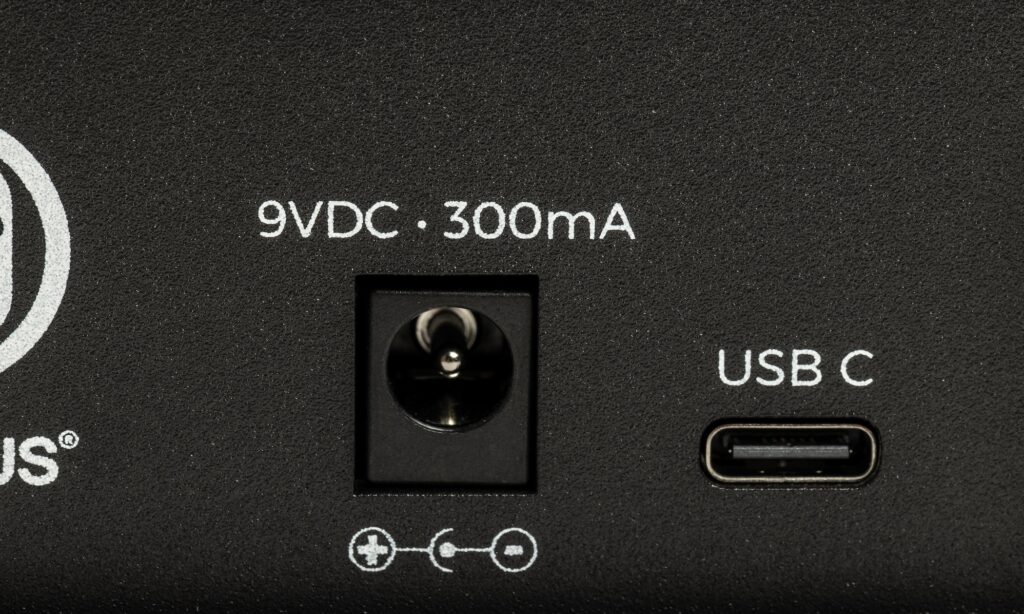 Das Walrus Audio Canvas Volume hat ein Gewicht von 993 Gramm und gehört mit seinen Maßen von (BxHxT) 92 x 45 x 225 mm eher zu den kompakteren „ausgewachsenen“ Volume-Pedalen. Alle Ein- und Ausgänge sind an der rechten Gehäuseseite zu finden, während der Anschluss für das Netzteil (mind. 300 mA) an der Stirnseite liegt. Hier gibt es auch einen USB-C-Anschluss für zukünftige Firmware-Updates.