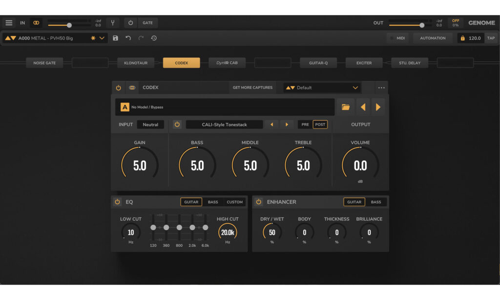 Der Amp-Block der Genome Suite enthält aktuell 33 verschiedene Modelle, darunter auch Bass-Amps und eine reine Endstufensimulation – ideal, wenn man die Software in Kombination mit einem externen Gitarren-Preamp nutzen möchte. Besonders interessant ist das Code X-Modul, das das Laden von Open-Source-Profilen (NAM, Proteus oder AIDA-X) unterstützt und bereits ab Werk mit einer Vielzahl hochwertiger Captures ausgestattet ist. Dieses Feature ist wirklich beachtlich und zeugt von einer praxisnahen und zeitgemäßen Auffassung. Die Amp-Auswahl ist ausgesprochen umfangreich und deckt ein breites Spektrum klassischer Marken ab – von Vox, Marshall und Fender über Peavey bis hin zu Mesa Boogie und vielen weiteren.